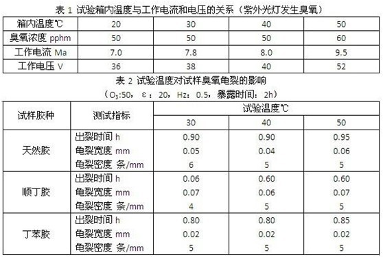 臭氧老化試驗(yàn)箱試驗(yàn)溫度的選擇通常是根據(jù)硫化橡膠使用環(huán)境的最高氣溫和試驗(yàn)設(shè)備的控溫條件等因素來(lái)確定的,另一方面還要考慮到臭氧容易受熱的作用而分解,所以臭氧老化試驗(yàn)的溫度不能過(guò)低,也不宜過(guò)高,GB/T13642-1992標(biāo)準(zhǔn)規(guī)定優(yōu)先選用的試驗(yàn)溫度為40±2℃。根據(jù)我國(guó)各地的氣候情況,最高氣溫通常達(dá)到37~44℃。在南方的夏天,氣溫經(jīng)常在30℃以上,要做30℃以下的試驗(yàn)是不可能的。但試驗(yàn)溫度也不應(yīng)超過(guò)60℃,否則,熱氧老化將逐漸起主導(dǎo)作用,而且會(huì)加速臭氧的分解,影響試驗(yàn)結(jié)果。表1示出臭氧老化試驗(yàn)箱內(nèi)溫度與發(fā)生臭氧的紫外光燈所需的電流和電壓的關(guān)系,可見(jiàn),當(dāng)溫度達(dá)到50℃時(shí),臭氧開(kāi)始分解,所需的工作電流和電壓都要相應(yīng)提高較多,才能保持所需的臭氧濃度。表2為試驗(yàn)溫度對(duì)硫化橡膠試樣臭氧龜裂影響到的試驗(yàn)結(jié)果。可看出溫度對(duì)臭氧龜裂程度影響不明顯,但對(duì)龜裂出現(xiàn)時(shí)間則有些小差別,如溫度50℃時(shí)試樣出裂時(shí)間則延遲了一些,說(shuō)明不同溫度試驗(yàn)的結(jié)果是不能作比較的。因此,采用40±2℃為試驗(yàn)溫度是比較適宜的。但GB/T13642-1992標(biāo)準(zhǔn)還推薦了可選用的其它試驗(yàn)溫度,如30±2℃或23±2℃,可供低溫度地區(qū)采用。
